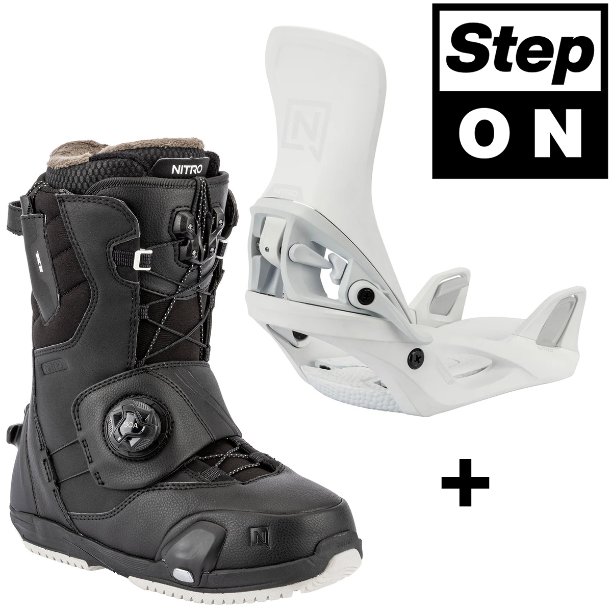 NITRO Step On ® + Cave TLS 2026: women's snowboard bindings + boots | HEAT Modlable | BOA ® | The Ultimate Fit & Convenient Interface | white & black