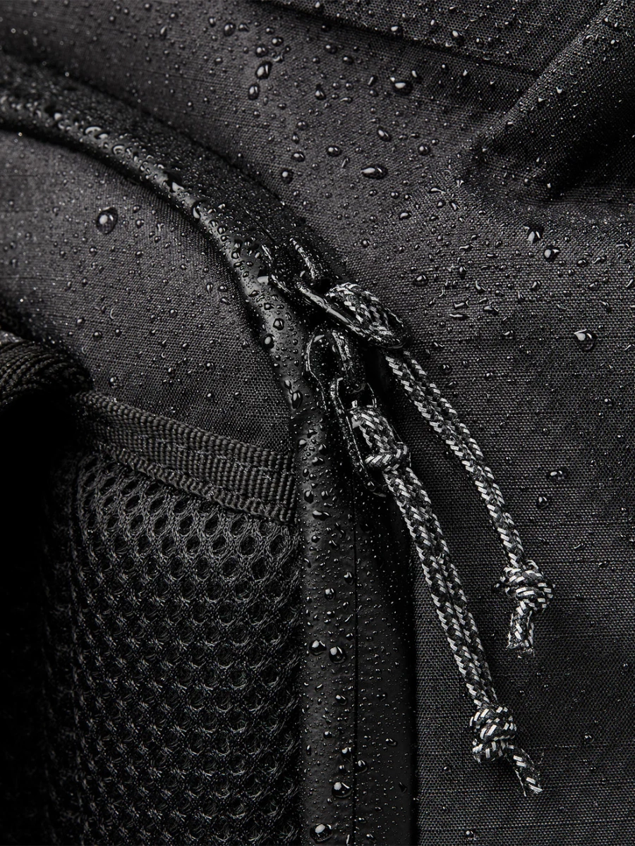 - The outer fabrics of the Proof products are made from 100% recycled PET bottles. The outer material has a water column of 13,000 mm. During production, the fabrics are elaborately treated on both sides with a water-based coating. However, under heavy water exposure, moisture may still penetrate through seams and zippers. For this reason, we describe these products as water-repellent rather than waterproof.