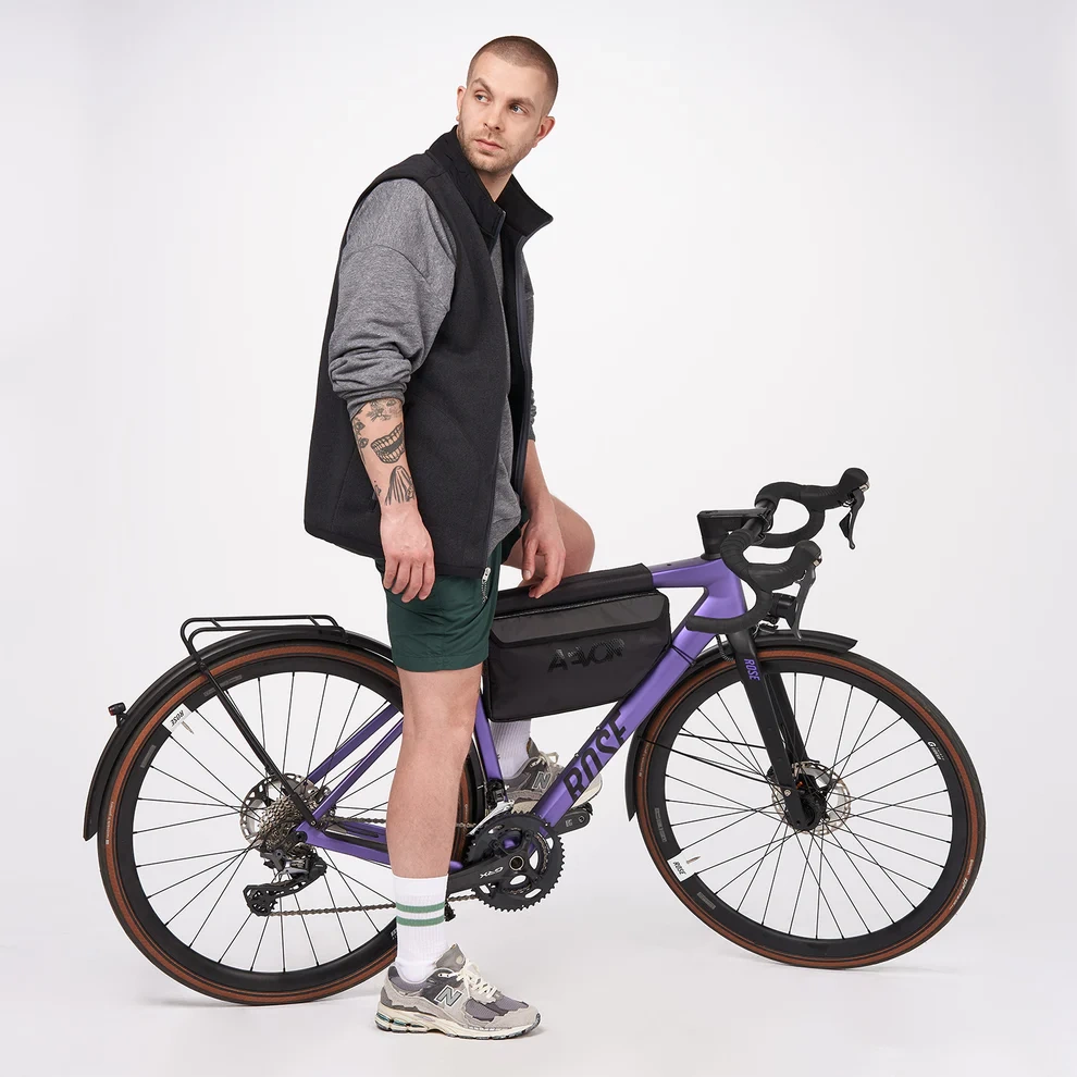 The outer fabrics of the Frame Bag are made from 100% recycled PET bottles. It keeps you dry with a 13,000 mm water column. The fabric is extensively coated on both sides with a water-based finish. However, under heavy water exposure, moisture may seep in through seams and zippers, so we classify these products as water-repellent rather than waterproof.
