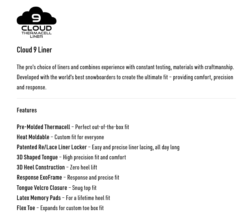 The pro's choice of liners and combines experience with constant testing, materials with craftmanship. Developed with the world's best snowboarders to create the ultimate fit – providing comfort, precision and response.