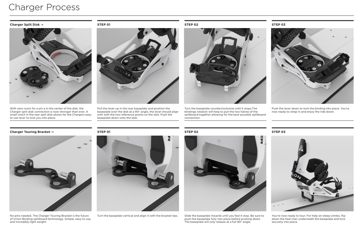 Looking to push the limits of your next splitboarding mission? The Charger FC is Union's lightest and most responsive splitboard binding. Tour further, faster and with less fatigue. The Union Charger FC is the go-to choice for professional splitboarders like Kevin Jones.