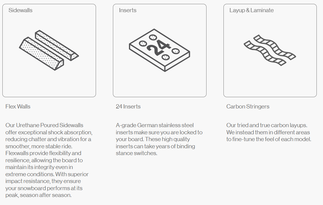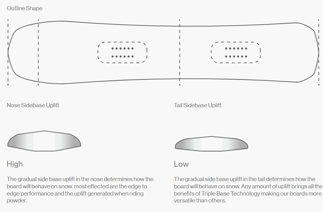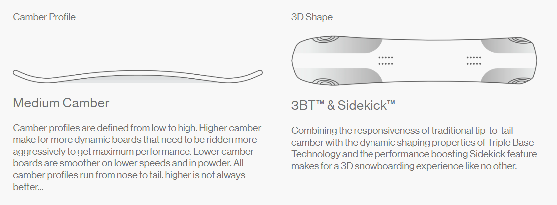 3BT™ + Sidekick™  Combining the responsiveness of traditional tip-to-tail camber with the dynamic shaping properties of Triple Base Technology and the performance boosting Sidekick feature makes for a 3D snowboarding experience like no other.