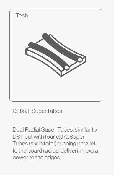 D.R.S.T. Super Tubes  Dual Radial Super Tubes, similar to DST but with four extra Super Tubes (six in total) running parallel to the board radius, delivering extra power to the edges.